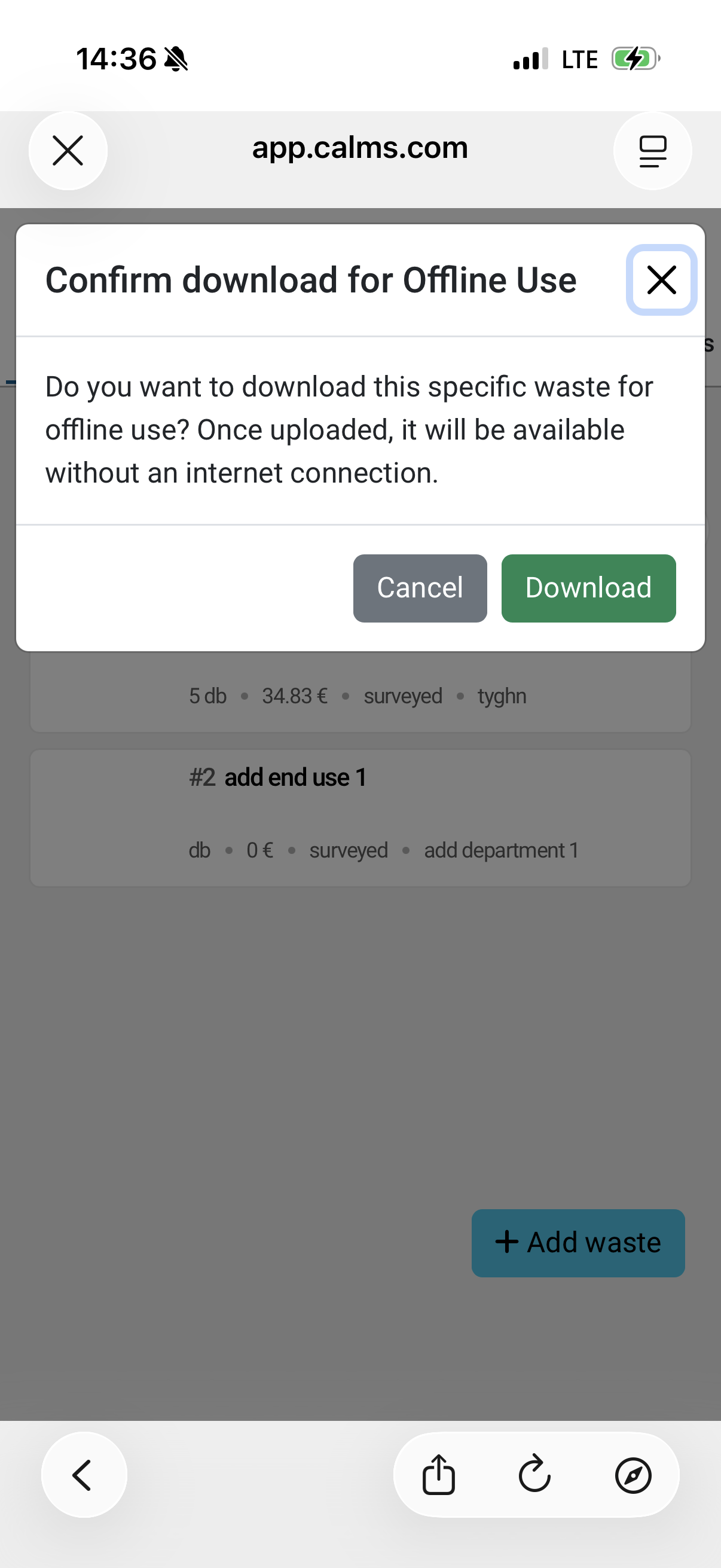 A confirmation window titled Confirm download for offline use will appear. Approve this to download the selected waste data for offline access.